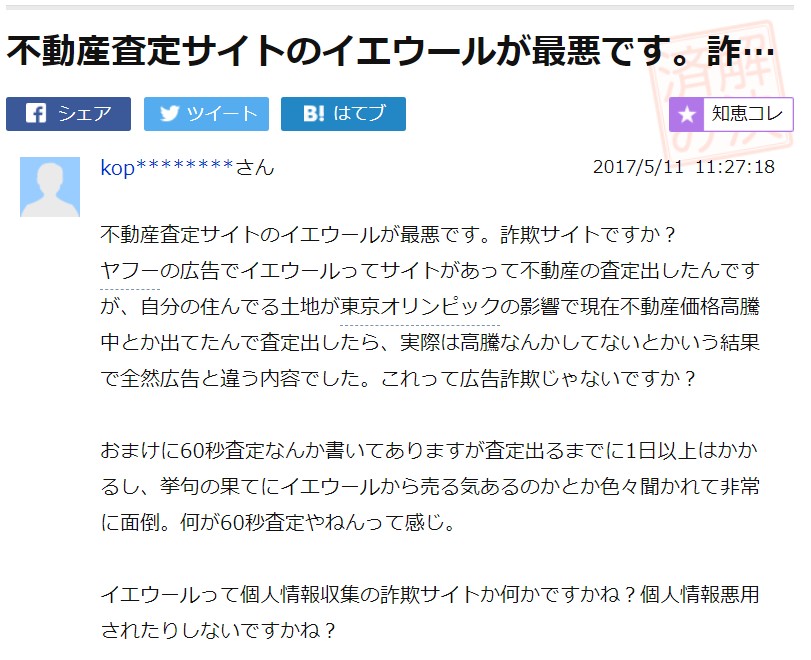 「イエウール 最悪」この言葉でネット検索してみると、ヤフー知恵袋でのこのような書き込みを発見しました。